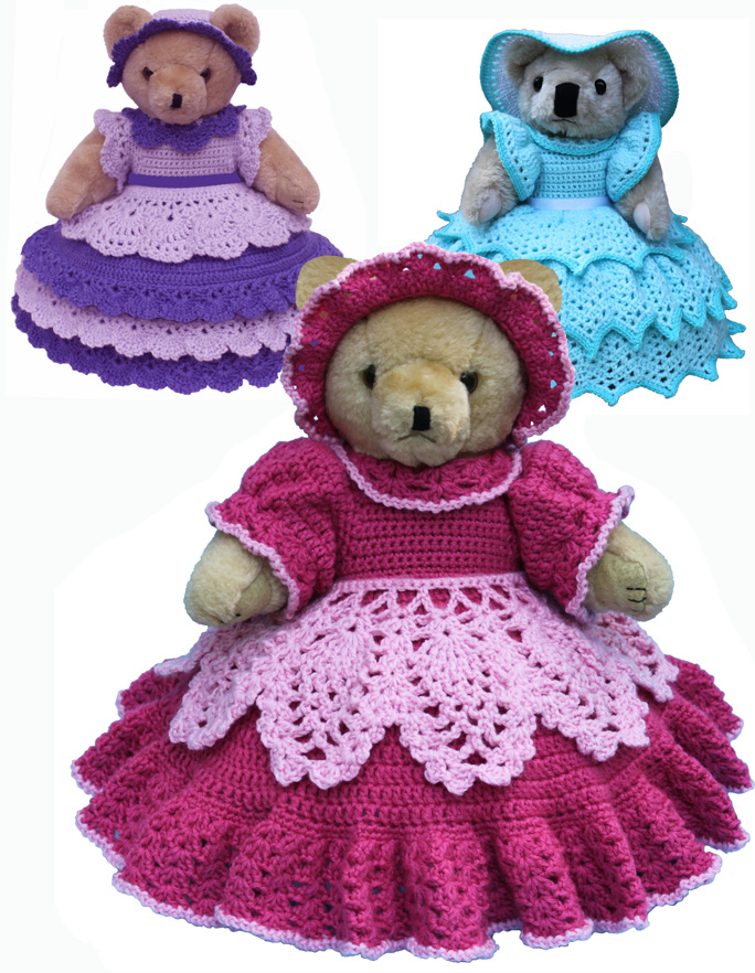 Bed Doll Bears, #1010. I designed these outfits to fit the popular 12 inch craft bears you will find in most craft stores. The outfits are made from sport/baby yarn, and the optional pillow doll base (instructions included) is made from worsted weight yarn. I thought this would make a cute and quick gift for the little ones. I don't see any reason why the outfits wouldn't fit some of the chubby baby dolls as well. Digest size booklet