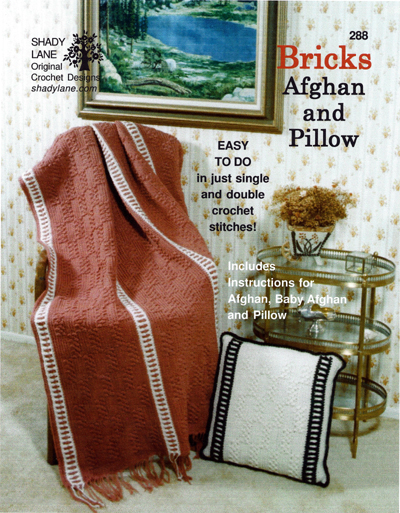 3-D alternating "brick" design is very easy to crochet in just single crochet and double crochet. Color pattern includes 45" x 67" afghan, 32" x 40" baby afghan and 14" pillow.