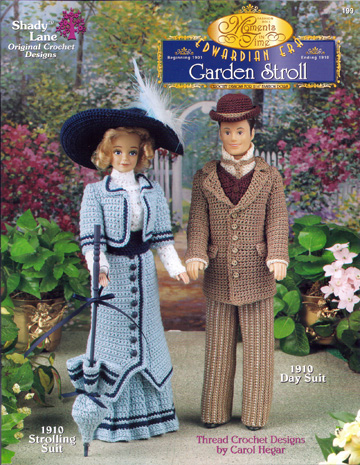 Garden Stroll, #199. Fourth in our Moments in Time Series featuring period costume designs in thread. 1910 Strolling Suit for her contains pattern for making pleated underskirt, overskirt, jacket, blouse, hat, cummerbund and umbrella from perle cotton (or substitute #10 thread). 1910 Day Suit for him includes pattern for striped pants, overcoat, vest, shirt dickie, tie and bowler hat, all made from #10 thread.